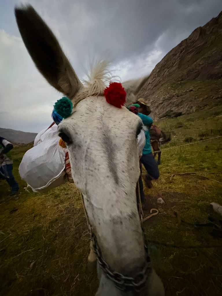 Around 19:10, the mules returned with our camp equipment. We had a lovely moment petting them (during which I captured the National Geographicesque photo below), then grabbed our gear and quickly set up our tents.