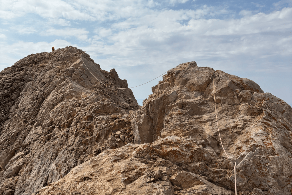 The first part of the climb took us through a dusty trail scattered with rocks of all sizes. At times, the cool scent of mountain herbs would suddenly hit us, floating through the air in short, refreshing bursts. We climbed steadily, occasionally hitting short rock sections — nothing too technical, but enough to mix things up. These little rock scrambles were a route choice by our leader; if you’d rather avoid them, there’s a more straightforward walking path that bypasses them entirely.